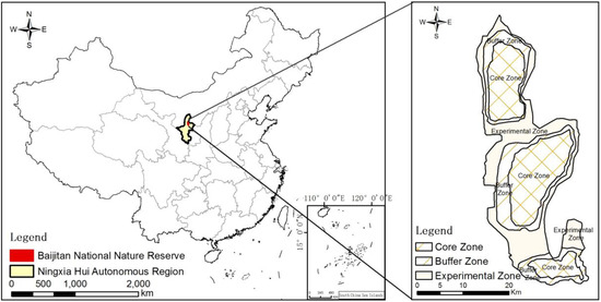 The Baijitan National Nature Reserve was established in 1985 to preserve the desert ecosystem. It is located in the eastern desert zone of Ling Wu, in the Ningxia Hui Autonomous Region (longitude 106°23′–106°48′ and latitude 37°54′–8°22′) (Figure 1). It covers approximately 74,843 hectares, its climate is a typical continental monsoon, and the average elevation is 1250 m. In the Baijitan National Nature Reserve, most of the desert vegetation has been well preserved, and its natural desert shrub communities are the largest and the most centralized type in China.
