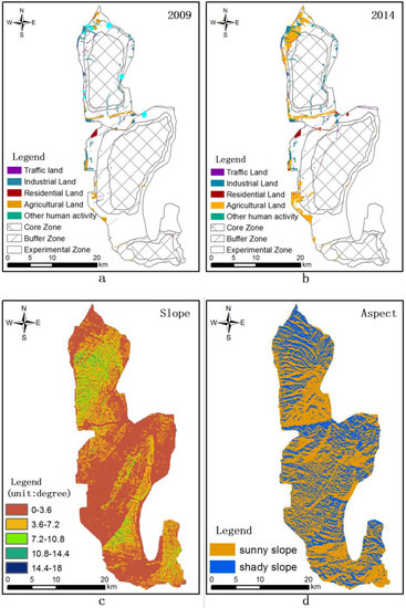 Base on the two GF-1 images and one Landsat (MSS/TM/ETM+) image, we extracted the human activities using the object-oriented classification method in 2009 and 2014 [34]. The results of the classification indicate that the extracted human activities (Figure 2) including agricultural land, industrial land, residential land, traffic land, and other human activities in the Baijitan National Nature Reserve. The slope and aspect were calculated based on DEM.