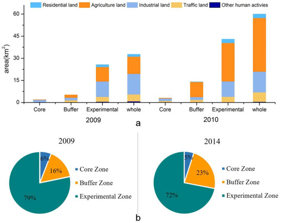 Compared with 2009, there were more human activities in 2014, and the total area extended to 60.01 km2. The residential, agricultural, industrial, and traffic lands had a different increase in their areas and the ratio of human activities in buffer zone increased clearly. For example, the agricultural land had the greatest change in its area, followed by the residential land and traffic lands. The agricultural land grew by 24.75 km2 (0.09 km2 in the core zone, 8.4 km2 in the buffer zone and 16.27 km2 in the experimental zone). The increase in residential and industrial lands occurred in the buffer zone. Only the traffic land increased in all three zones (Table 2 and Figure 3).