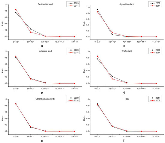 Ratio of human activities in different slope zones: (a) Residential land; (b) Agriculture land; (c) Insdustrial land; (d) Traffic land; (e) Other human activity; (f) Total.