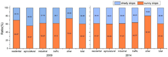 Table 5 and Figure 5 show the area ratios of human activities on sunny slopes in 2009 and 2014, which were higher than 60% and significantly higher than those in the shady slopes. In 2009, 69.87% of residential land, 55.97% of agricultural land, 62.24% of industrial land, 61.90% of traffic land, and 73.91% of other human activities occurred in the sunny slopes. In 2014, 61.57% of residential land, 60.09% of agricultural land, 61.41% of industrial land, 63.77% of traffic land, and 80.36% of other human activities occurred on the sunny slopes. Thus, sunny slopes are advantageous for human activities. The south-facing slopes can provide more sunshine; therefore, they are more conducive to human life than the north-facing slopes, where people generally choose to live.