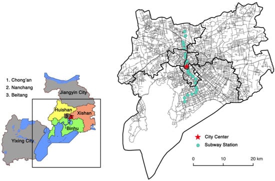 Wuxi, located in eastern China, is one of the cities representative of fast urbanizing China and also has great potential to develop sustainable transport systems. We selected Wuxi city as the study area for two main reasons: Firstly, as one of the largest cities in the Yangtze River Delta region of China, from 2000 to 2015, Wuxi has approximately tripled its urban built-up area from 110 km2 to 320 km2 and increased fivefold its urban population from 0.6 to 3 million, depicting an ideal representation of Chinese cities in the fast urbanization process. Secondly and the most importantly, the first subway line (Line 1) of Wuxi just opened in 1 July 2014, making it possible to measure the impact of subway to urban transportation networks with data collected via Metro Card and taxi GPS. Figure 1 shows the boundary of Wuxi and the 24 subway stations (green dots) of Line 1.