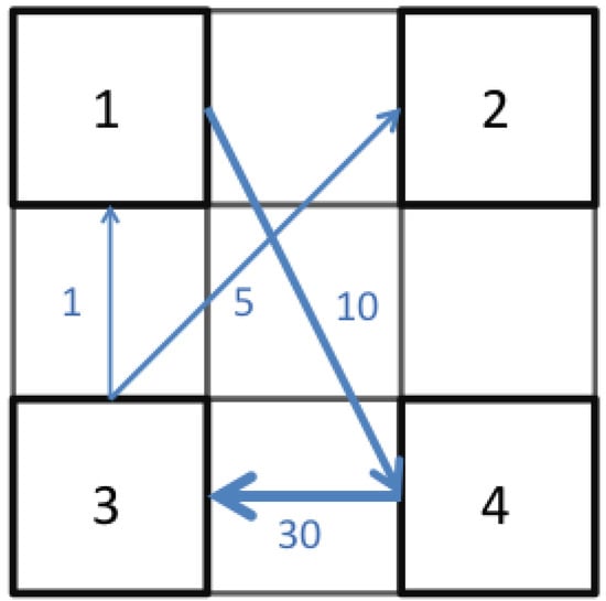 Illustration of network construction. Boxes 1–4 represent four nodes, and gray arrows represent four direct edges, number on each arrow represents the traffic volume.
