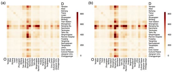 Subway O–D matrix; the order of stations is organized as the spatial sequence along Line 1. (a) Weekday; (b) Weekend.