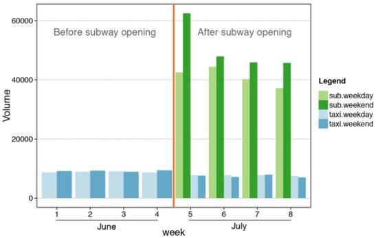 In general, if we compare the change in total volume (Table 3), the subway volume is around 40,000–50,000 persons/day, which is much larger than the reduction in taxi volume, being only 1200 on weekdays and 1800 on weekends (note that we only use 1500 taxis, accounting for about 40% of the total number of taxis). Therefore, the operation of the subway may have more impact or substitution effect on other transportation means such as buses or private cars. In other words, a number of people who took a bus or private car before are more likely to choose the subway after its opening. At the same time, people’s travel demands are very likely stimulated by the new subway, which led to the huge differences between the ridership increase in subway and decrease in taxi.