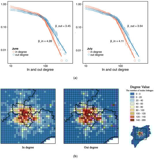 (a) Cumulative degree distribution of spatial connections in nodes linkages of taxi networks before and after the opening of the subway. Left: June cumulative in- and out-degree distribution (log-log); right: July cumulative in- and out-degree distribution (log-log). The straight line in each graph is the power-law fitting line; (b) Geographical distribution of in-degree (left) and out-degree (right) before the opening of the subway. Left: June in-degree distribution; right: June out-degree distribution. (All colors are in the same scale). The degree value is the number of nodes (not edge) linkages rather than O-D counts numbers, which denotes the degree of spatial connection.