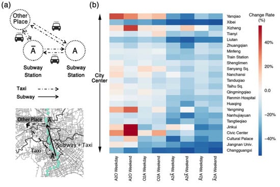 Taxi ridership patterns. (a) Taxi O–D diagram. A to O(A2O) means from station A to Other place by taxi, O to A(O2A) means from other place to station A by taxi, A to (A2) means from station A to by taxi, to A (2A) means from station to A by taxi, where represents the sum of all other stations except A; People may choose subway + taxi for longer distance trips after the opening of subway; (b) The heat map of taxi volume variations. X-axis represents eight different travel modes (four modes mentioned above (a), two time periods are Weekday and Weekend). Y-axis represents 24 stations, with Sanyang Square and Nanchansi being the urban central areas. The red and blue indicate increasing and decreasing rates respectively.
