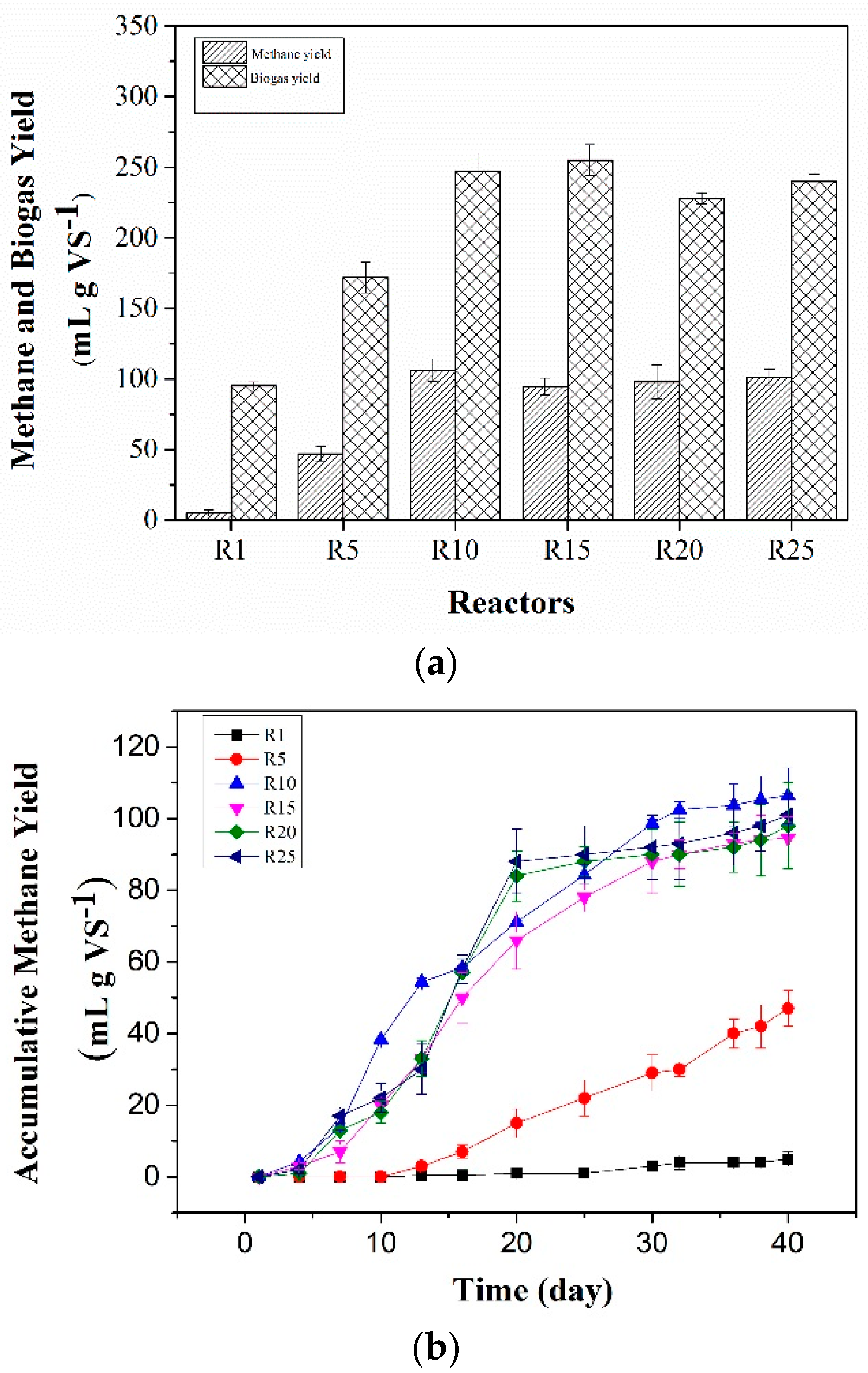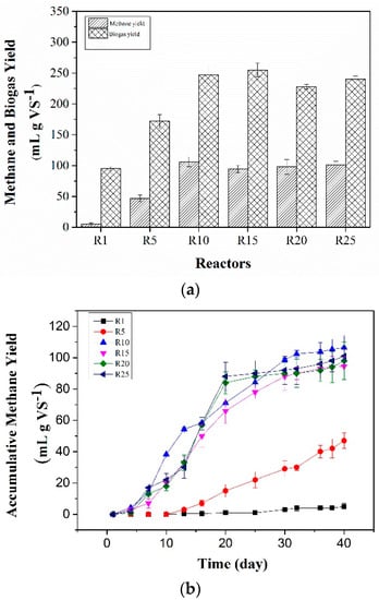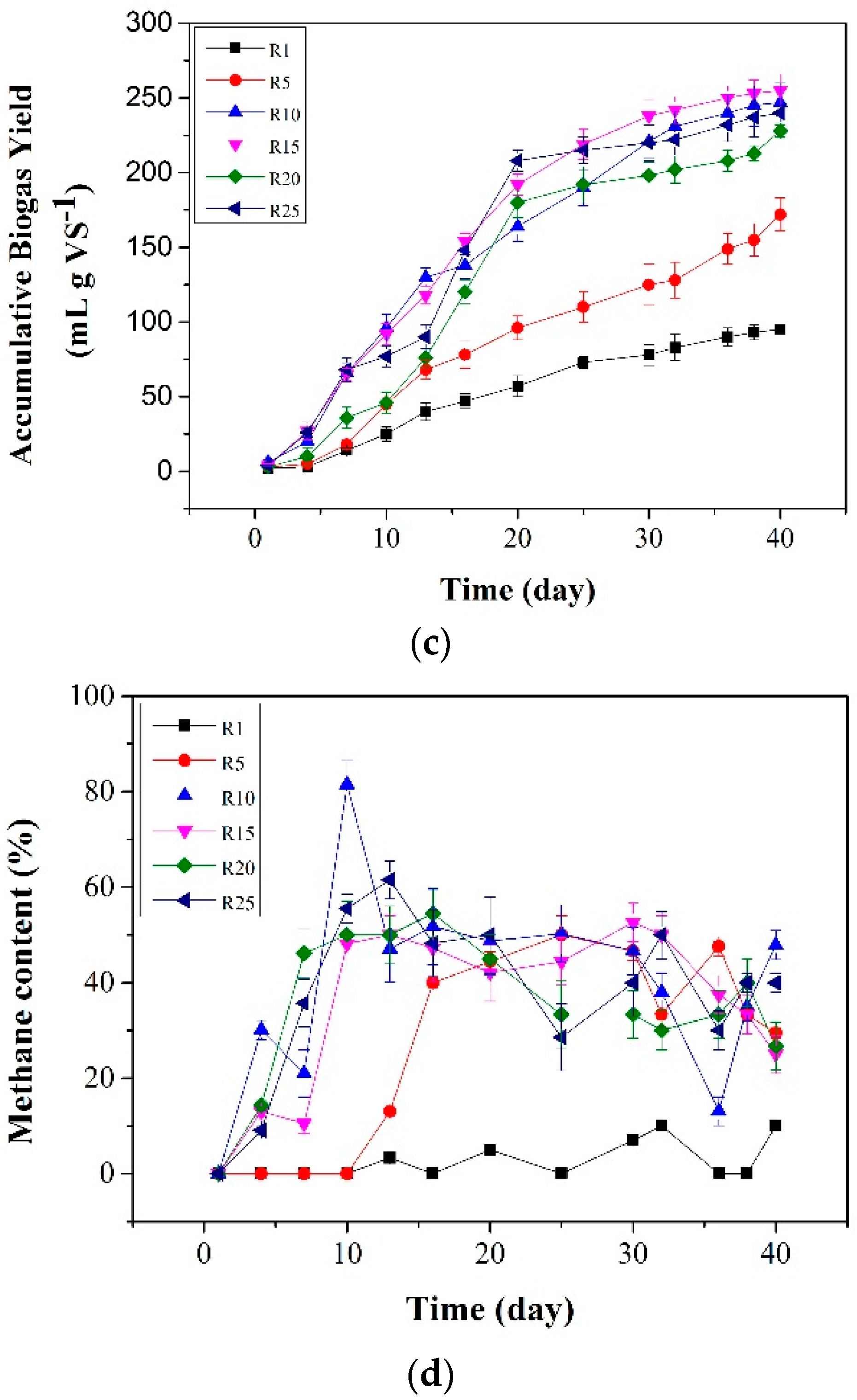 The experimental bioreactors were run in batch mode for 40 days. The methane yields of R10, R15, R20 and R25 ranged from 96 mL·g·VS−1 to 106 mL·g·VS−1 with R10 being the highest yields (Figure 1a). The results of accumulative methane and biogas yield showed that the rates of methane and biogas production of R10, R15, R20, and R25 were not greatly different from each other during the 40-day anaerobic digestion (Figure 1b,c), whereas the rates of methane and biogas production of R1 and R5 were much lower than that of R10, R15, R20, and R25 during all the digestion times (Figure 1b,c). R1 and R5 achieved 5 mL·CH4·g·VS−1 and 47 mL·CH4·g·VS−1 and the corresponding biogas yields were 95 mL·g·VS−1 and 172 mL·g·VS−1 respectively, much lower than that of R10, R15, R20, and R25 (Figure 1a). On days 0–10, almost no methane was produced in R1 and R5 (Figure 1b), and the methane content was 0% in these reactors (Figure 1d). However, the methane content in other reactors began to increase on day 3 and fluctuated between 16% and 83% during the anaerobic digestion (Figure 1d).