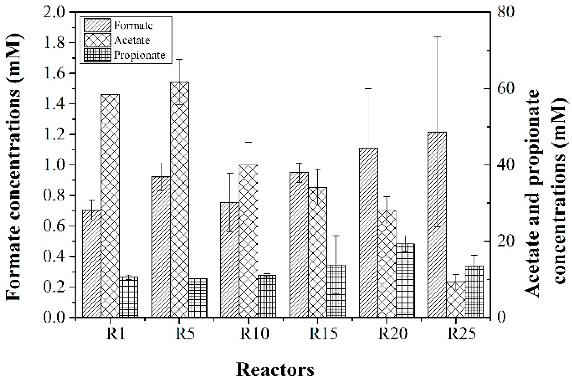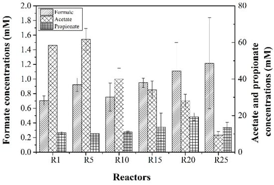 The formate, acetate, and propionate concentrations at the end of the 40-day anaerobic digestion. Data represent the means of six replicates, with error bars representing the standard deviation of the mean.