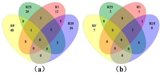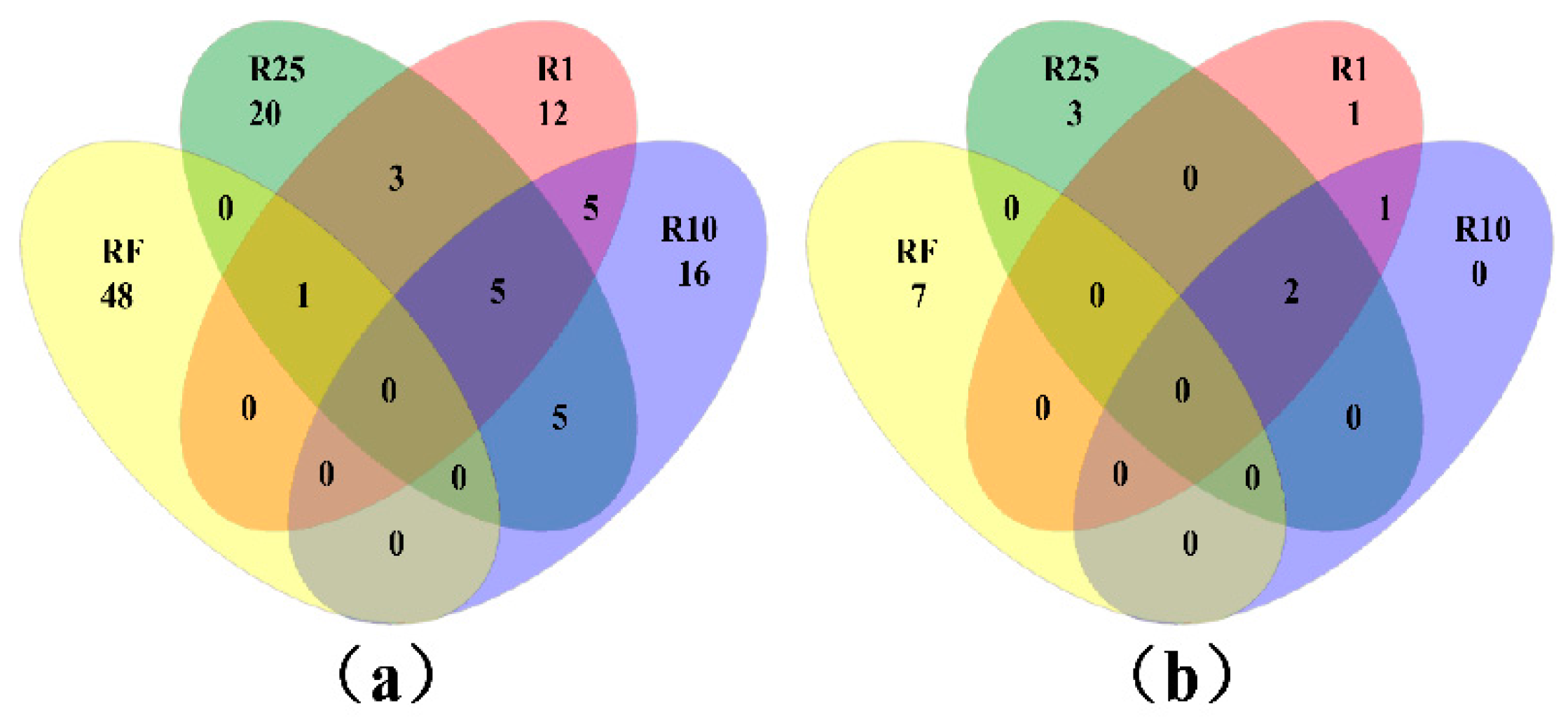 Venn diagrams of shared OTUs among RF, R1, R10, and R25 in (a) bacterial and (b) archaeal libraries, respectively.