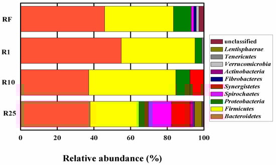 The highest methane yield (106 mL·g·VS−1) was achieved in R10, which was a little lower than other anaerobic batch reactors with lignocellulose as the sole substrate [38,39]. The results implied that rumen microorganisms might not be the best inoculum for the in vitro biogas digestion of lignocellulose. The rumen microbial communities might have changed when they were inoculated in the reactors. Thus effluence of R1, R10, and R25, representing the poor-working, well-working, and well-working with high RF concentration reactors respectively, were integrated with RF to characterize the changes in rumen microbial communities.