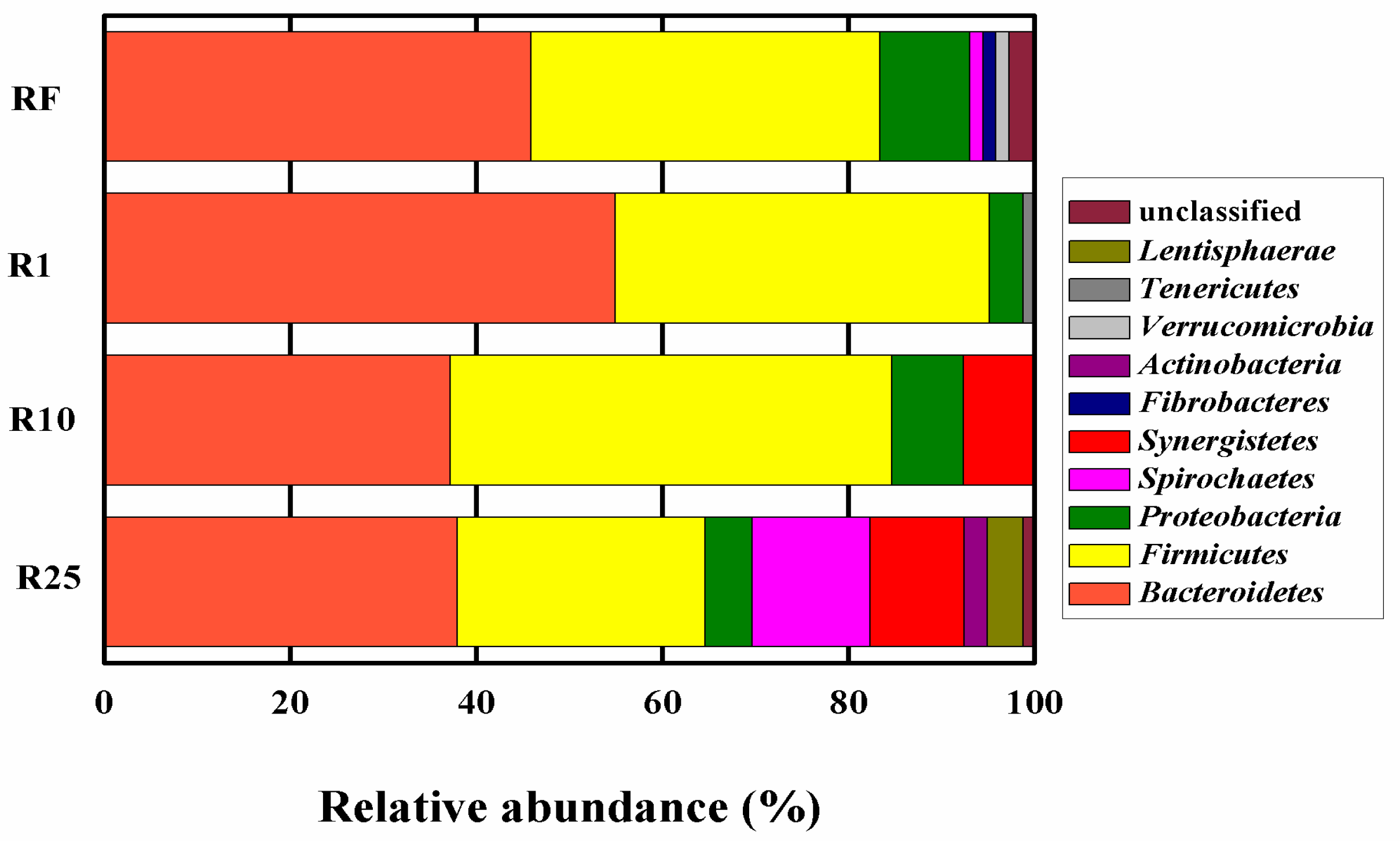 The identified genera and their relative abundance in RF, R1, R10, and R25 respectively.