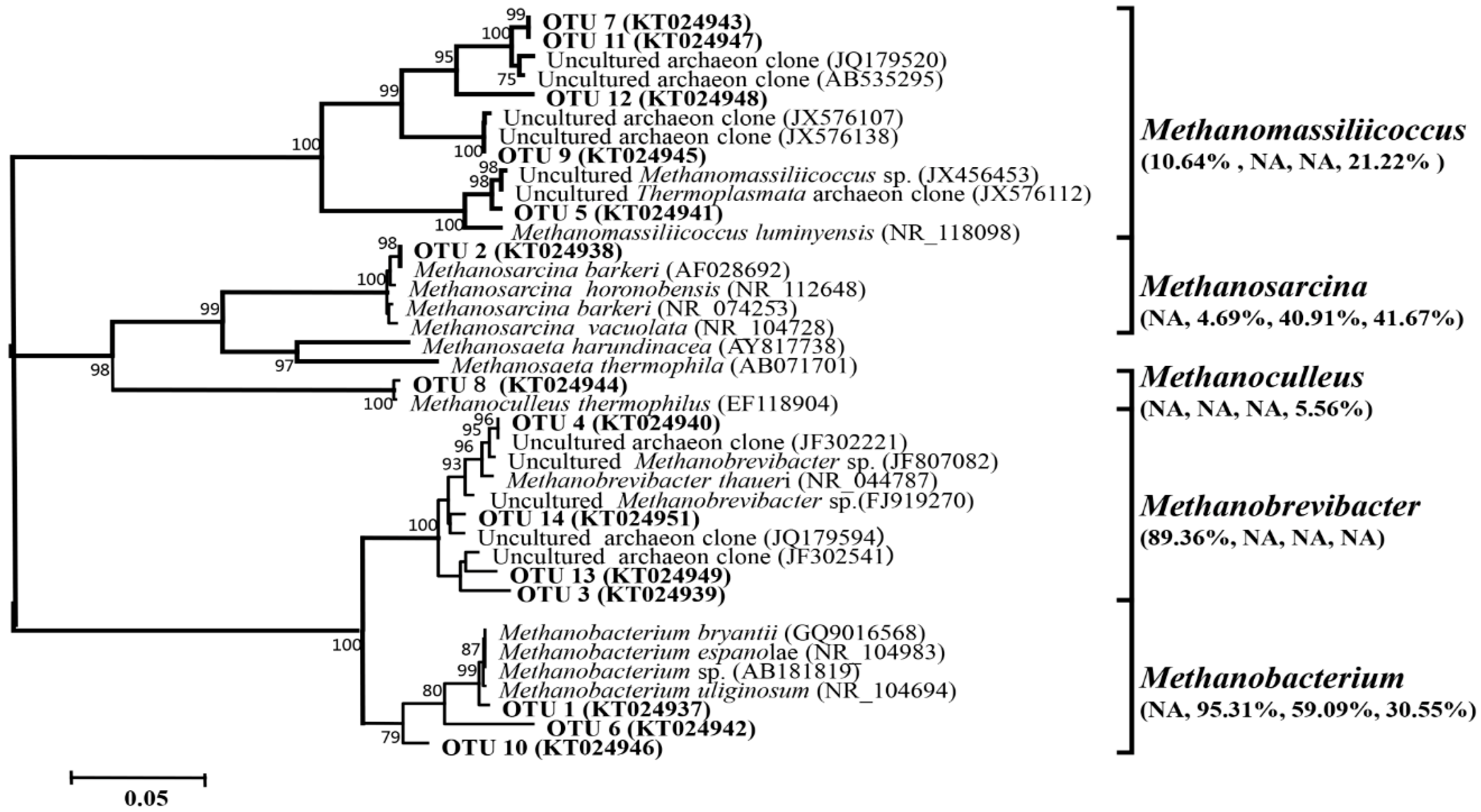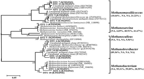 All of the obtained archaeal sequences in this study were affiliated to phylum Euryarchaeota, and these sequences could be assigned to five genera including Methanobrevibacter, Methanobacterium, Methanosacina, Methanoculleus, and Methanomassiliicoccus (Figure 5).