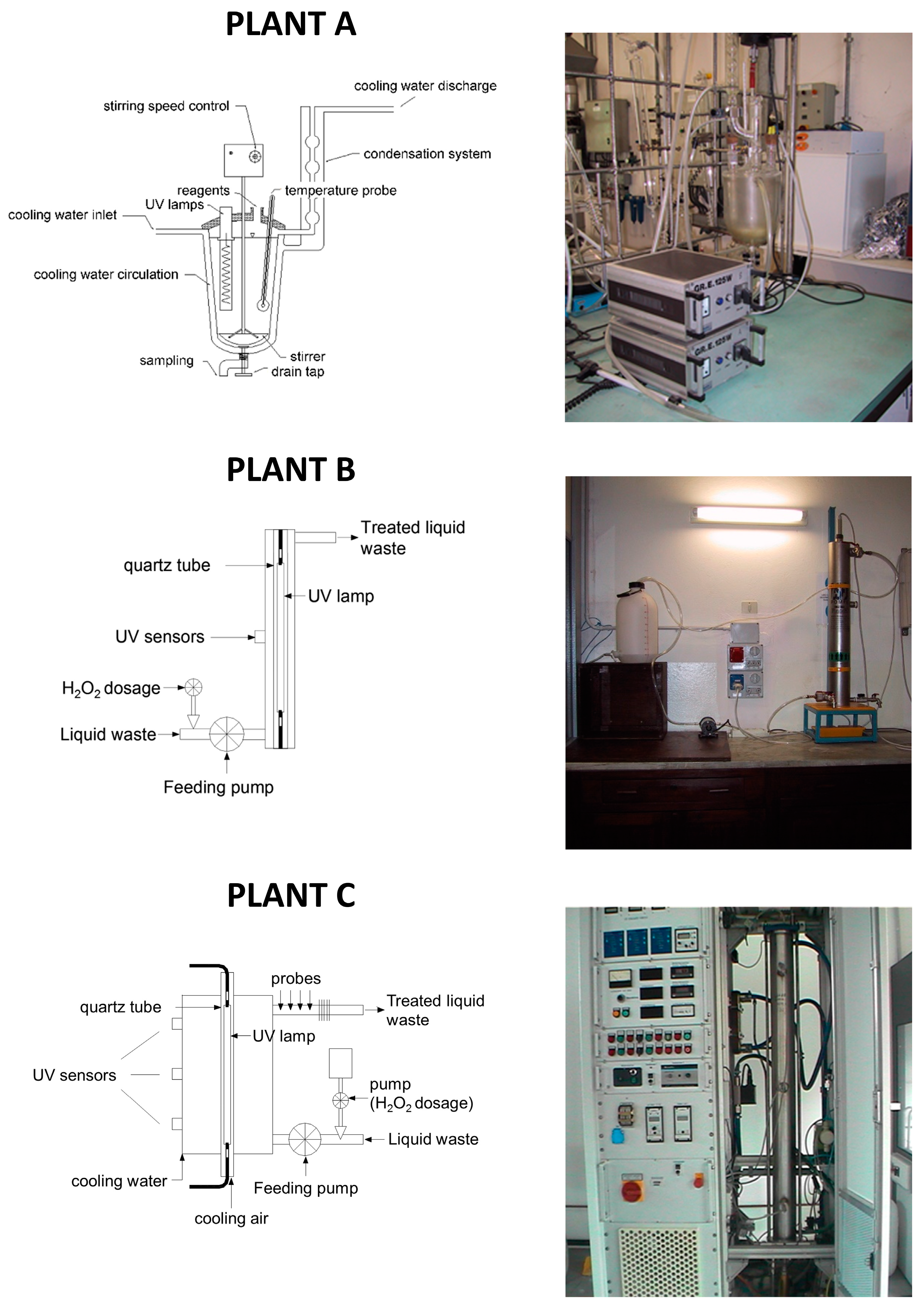 Photo-Fenton and H2O2/UV tests were carried out by means of three different plants (A, B, and C, respectively) with the aim of studying the influence of the UV lamp type (having different energy consumption and emission spectrum) and the reactor shape/geometry, both on the atmospheric oxygen transfer and on process performance. H2O2/UV tests were conducting using all the three plants; photo-Fenton tests were performed on plants A and B.