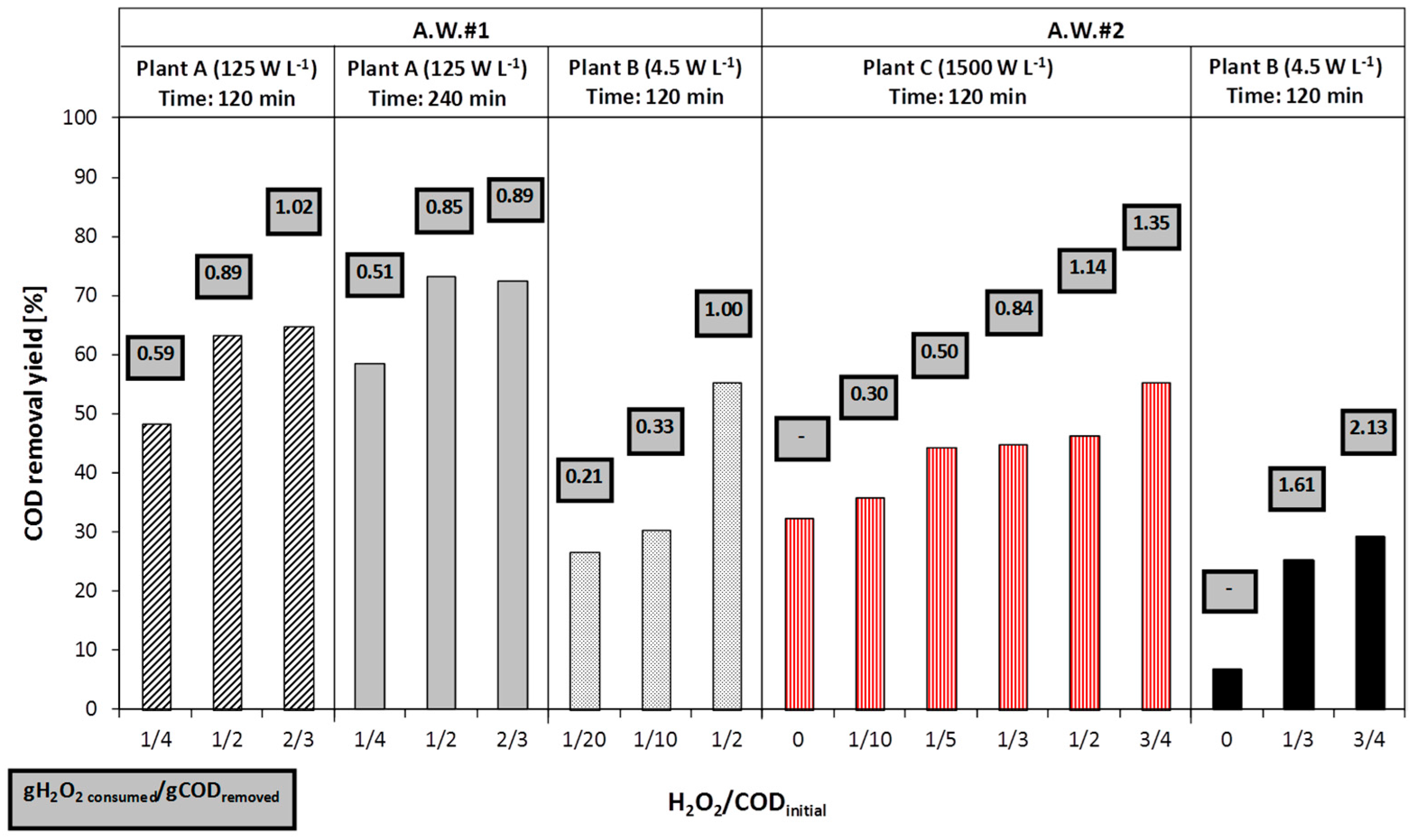For all tests (with the exception of the one carried out on A.W.#2 with plant B and H2O2/CODinitial = 3/4), the ratio (H2O2 consumed/COD removed) was far below the stoichiometric value 2.125 gH2O2·gCOD−1 and it was proportional to the dosage of hydrogen peroxide dosage (Figure 2). This may be explained considering the reciprocal role of hydrogen peroxide and UV radiation: likely, the role of the oxidation mechanisms that involve H2O2, with respect to photolysis, depend on the hydrogen peroxide dosage.