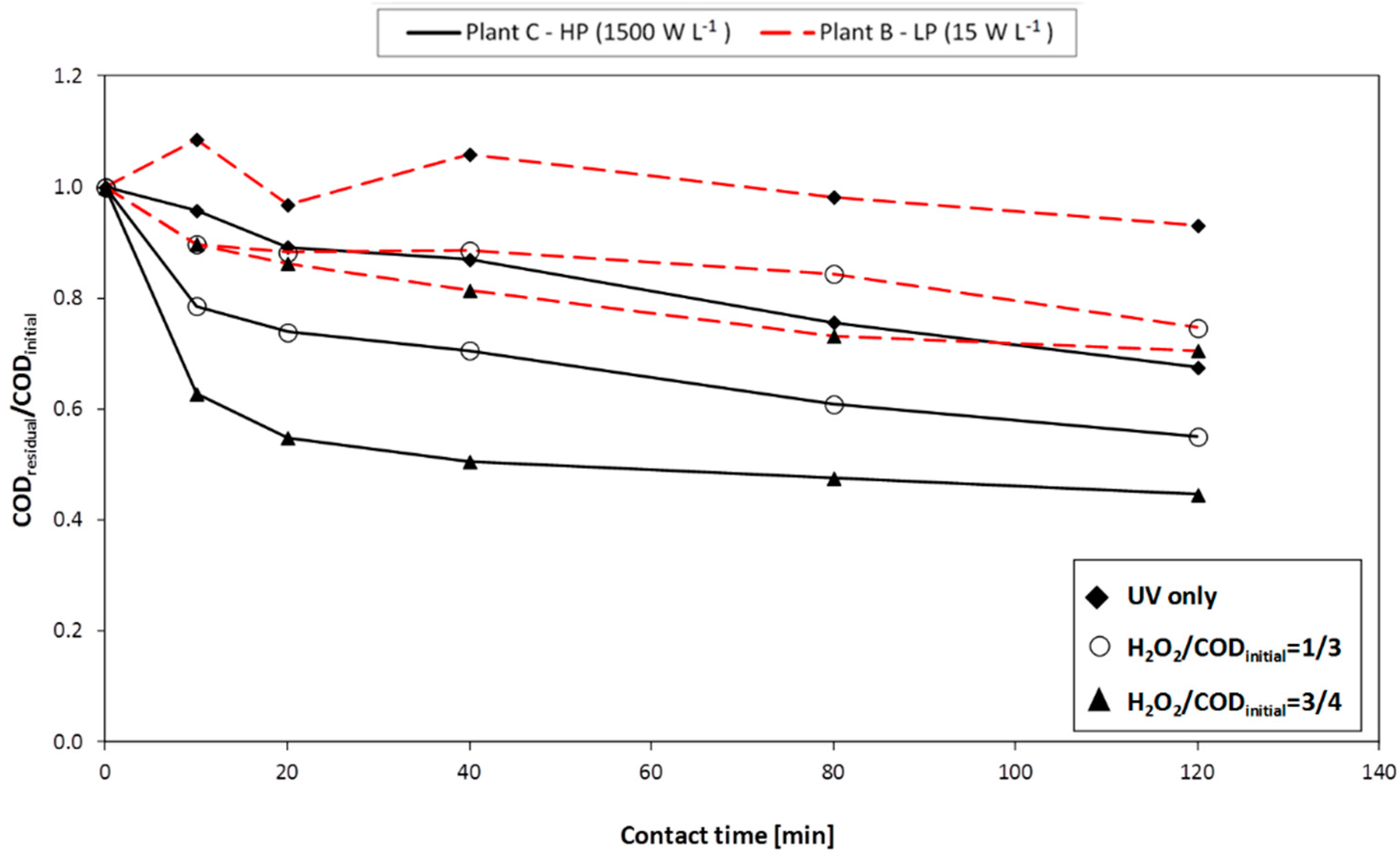 Under the same dosage of hydrogen peroxide dosage conditions, the use of a high-pressure UV lamp (plant C) led to COD removal yields higher compared to those achieved with a low-pressure UV lamp (plant B).