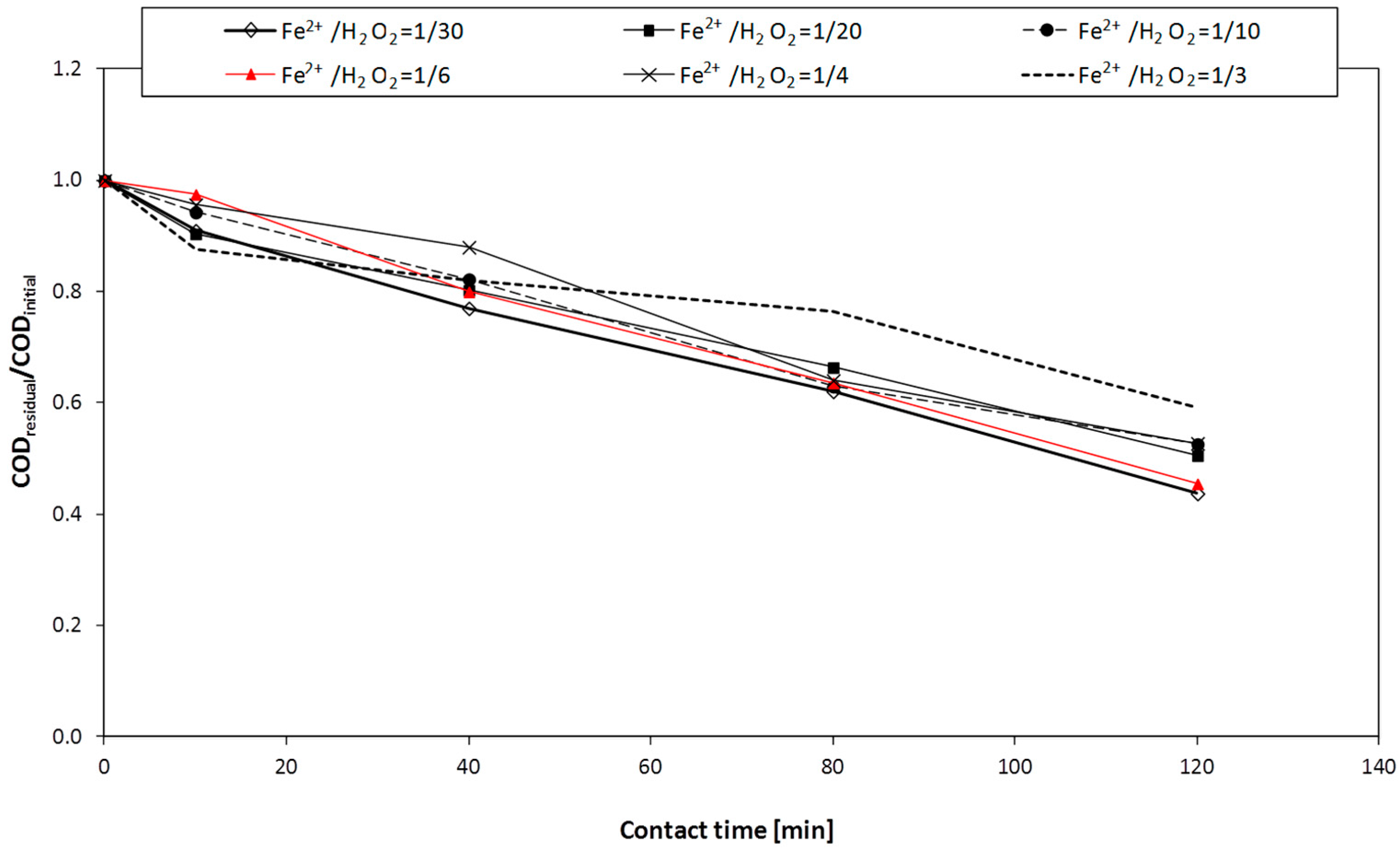 For both tested aqueous wastes, the increase of hydrogen peroxide dosage enhanced the COD removal efficiency. Nevertheless, the efficiency was only slightly improved for H2O2/CODinitial dosage ratios greater than 1/2, which can be regarded as an optimal value. Similarly, doubling the reaction time (from 120 up to 240 min) did not lead to an appreciable improvement of process performance.