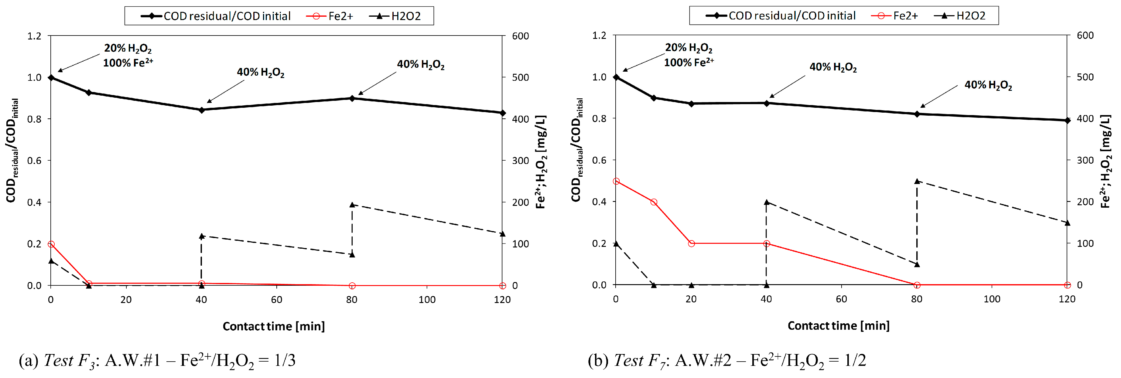 A higher dosage of iron increased the COD removal yields, especially for A.W.#2 (Table 5); however, the removal efficiencies obtained during Fenton tests were lower, compared to the other AOPs. This was probably due to the low amount of dosed iron (the ratio [Fe2+]dosed/[H2O2]dosed being lower than 1) that was not sufficient to completely consume all the added hydrogen peroxide (see Figure 5).