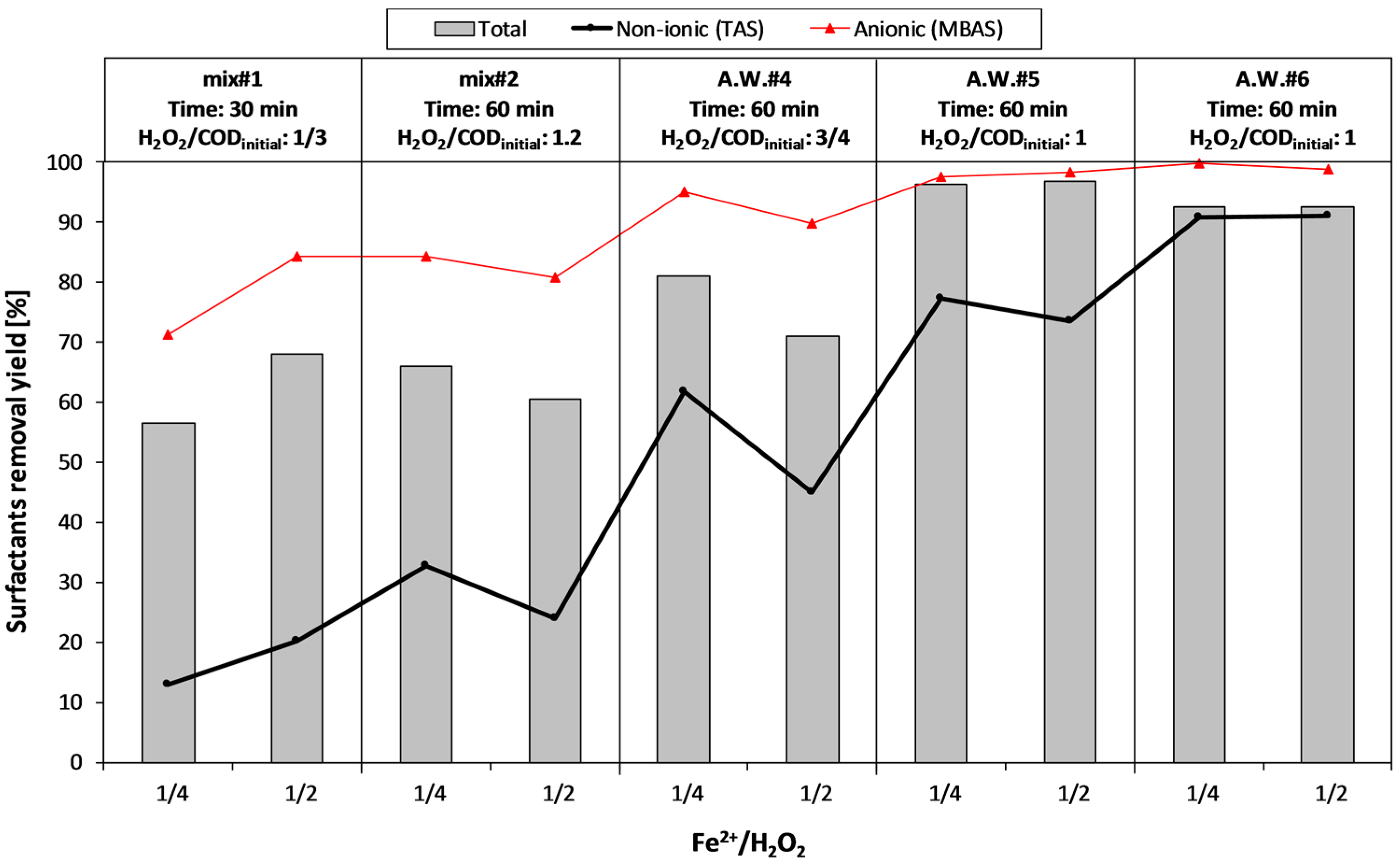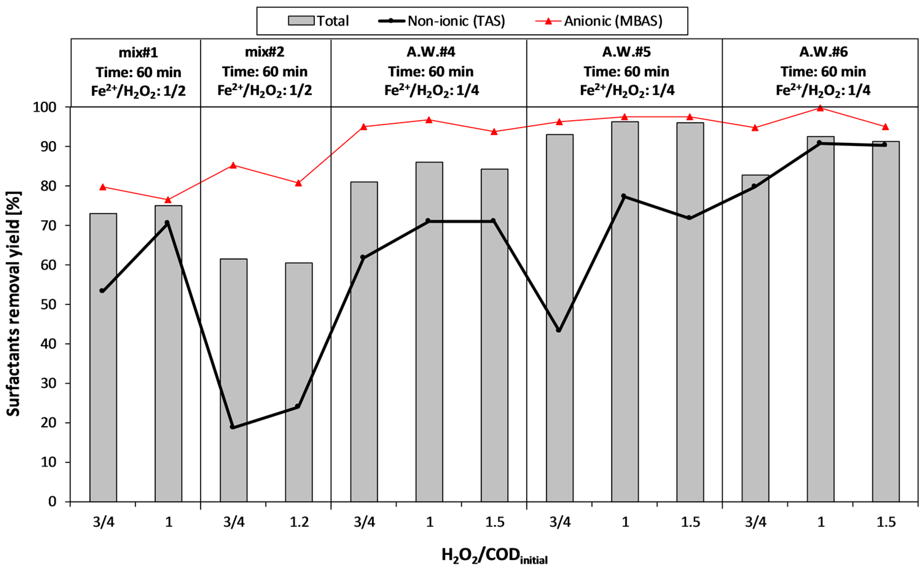 It can be seen that the increase of H2O2 dosage up to a value of the H2O2/CODinitial ratio equal to 1, led to an improvement of surfactants removal, especially for TAS. A further increase of the hydrogen peroxide dosage (from 1 to 1.5 H2O2/CODinitial) did not lead to any improvement in surfactant removal yields (both for anionic and non-ionic forms).
