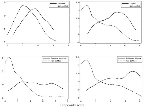 37]. We only use observations in the common support region (i.e., where the PS of treated observations is not lower than the PS of control observation and the PS of control observations is not larger than the PS of treated observations). We visually compare overlap in the propensity score distribution between certified and non-certified observations. We further assess balancing properties by comparing covariate means between treated and matched controls using two-sided