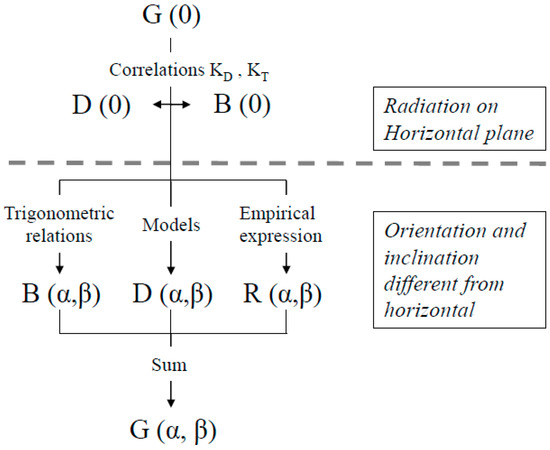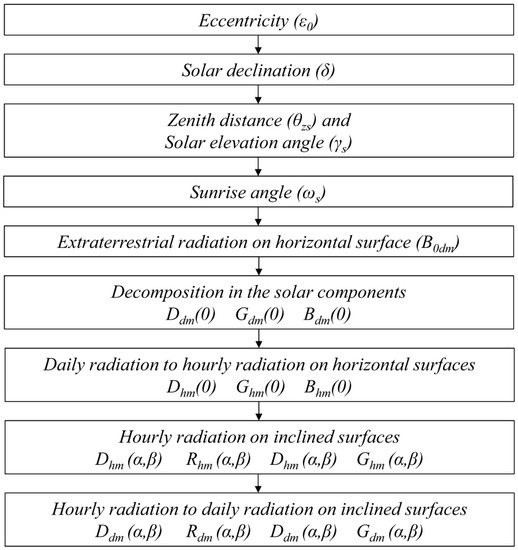 Once this data is collected, it is necessary to use complex mathematical equations and algorithms to obtain solar radiation values for any tilt and orientation of the modules. A mathematical procedure based on the values of global solar radiation on horizontal surfaces is carried out, as briefly shown in Figure 1.