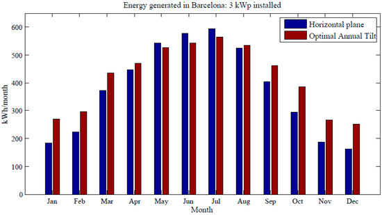 Moreover, it can be observed how the energy that could be obtained in a photovoltaic installation located at Barcelona is less than could that one that be obtained in Jaén for a system with the same installed power. In Barcelona, 4518.19 kWh and 5004.02 kWh could be obtained annually with a system consisting of modules placed horizontally and positioned to the optimal tilt, respectively. In Jaén the results would be 5111.34 kWh and 5592.23 kWh. This is due to the greater amount of radiation in the city located in the south of Spain. As mentioned in previous sections, the energy generated by a system is directly proportional to the energy reached at the system.