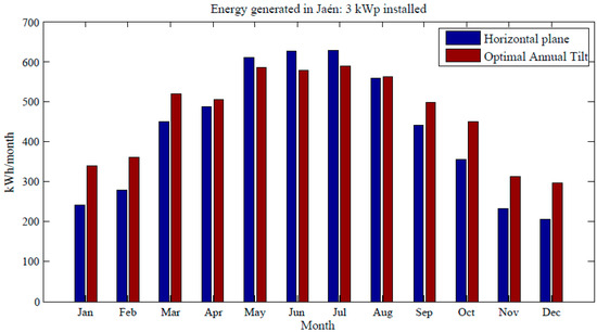 In this case the situation is quite similar; it has the same behaviour. In Jaén, an installation composed of photovoltaic modules in the horizontal position would generate in 610.47 kWh, 626.30 kWh, and 627.91 kWh in May, June, and July, respectively. However, the total amount of energy generated annually is 5111.34 kWh. On the other hand, taking into account the optimum inclination can be obtained 5592.23 kWh per year, reaching 584.48 kWh, 578.30, and 588.79 kWh in the months of May, June, and July. Therefore, the gains would be 480.89 kWh per year.
