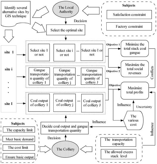 Global model for CGF site selection: To mitigate coal gangue contamination, the local authority plans to establish a coal gangue recycling facility, for which CGF site selection is particularly important. The government is responsible for the selection of the CGF site, but is constrained by the site decision, local policies and the coal output and gangue transportation plan from each colliery. When selecting a CGF site, the local authority first ensures the collieries’ satisfaction degree and then seeks to minimize the total coal gangue stacks, as expressed in Equation (2). The site selection decision should also maximize total social revenue, as expressed in Equation (3), which is dependent on the collieries’ decisions. To achieve profit maximization, as expressed in Equation (7), colliery owners decide on the coal output and gangue transportation plan based on the selected CGF site. Because there are unavoidable conflicts within the CGF-SS system, it can be described as a typical Stackelberg game between the local authority and collieries. In this situation, it is too difficult to describe the complex inherent relationship using a simple site selection model. Therefore, based on Equations (1)–(13), a bi-level model is formulated to deal with these conflicts, as follows: