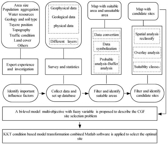 The GIS technique provides a framework for collecting, storing, analyzing, transforming and displaying spatial and non-spatial data. In particular, it has been successfully applied to screen for the suitable seismic station sites [39] and to identify potential sites for soil and water conservation techniques [41]. Because of these successes, this paper seeks to screen for viable CGF sites based on the geospatial data GIS technique using spatial data modeling tools and a spatial analysis method, for which ArcGIS software ( ArcGIS 10.2; Esri: Sacramento, CA, USA ) and MapInfo are applied as the core spatial data analysis GIS platforms. Joachim et al. [39] developed a GIS framework for seismic station identification, which is used as the basis in this study for the proposed GIS based bi-level modeling method. The flowchart for the GIS-modeling technique is shown in Figure 2.