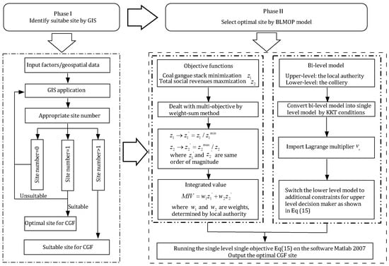 Based on the above analysis, an optimal CGF site selection problem has two parts: identifying alternative sites and screening the most appropriate site. At the beginning, a GIS technique is used to integrate geospatial data so as to screen candidate sites, a technique that has been applied successfully to site identification in many projects [39]. Once alternative sites have been identified, a bi-level multi-objective programming (BLMOP) model with fuzzy variables is formulated to determine the optimal site. In this situation, the bi-level model describes the conflicts between the government and each colliery. In addition, a multi-objective technique is applied to find the equilibrium between environmental protection and economic development, and the uncertain environment is dealt with using fuzzy theory [40].