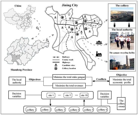 Yanzhou coal field occupies 3400 square kilometers in the southwest of Shandong Province. The total coal reserves are estimated to be around 9.1 billion tonnes. The research region is shown in Figure 5. There are six major collieries in this area; the South Tuen colliery, the Xinglongzhuang colliery, the Baodian colliery, the Dongtan colliery, the Jining No. 2 colliery, the Jining No. 3 colliery (i.e., ST, South Tuen; XLZ, Xing longzhuang; BD, Baodian; DT, Dongtan; JN2, Jining No. 2; JN3, Jining No. 3). The locations for all collieries are also shown in Figure 5. Yanzhou coal field produces thermal coal, and the carbon in gangue is greater than 20%; hence, it can be used to generate electricity [48]. In other words, the local authority wishes to build a coal gangue power facility (CGPF) to achieve the coal gangue contamination reduction.