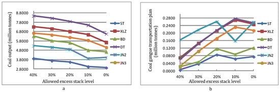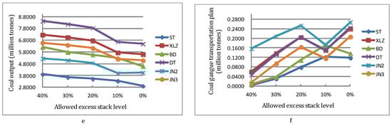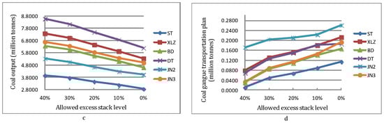 When the government changes the environment protection constraint φ, as shown in Table 6, Table 7, Table 8 and Table 9 and Figure 6, Figure 7 and Figure 8, the reaction of each colliery is very different. Taking the situation as an example, Figure 8 indicates that when the allowed excess stack level changes from 40% to 30%, the XLZ and DT collieries can adjust the coal gangue transportation plan to guarantee the coal output. However, ST and JN2 collieries have to decrease more coal output to realize the 10% stack reduction target. When the allowed stack level changes from 20% to 10%, the ST and JN2 colliery also have to decrease more coal output to realize the 10% stack reduction target. However, in this situation, the coal output of the two colliery can just meet the basic demand. Under a lower allowed excess stack level, the change margin in coal output and coal gangue transportation quantity of XLZ and DT collieries is relatively small, compared with ST and JN2 collieries. Under the circumstances, the XLZ and DT collieries with smaller mining gangue coefficients can obtain larger transportation capacity in the coal gangue facility recycling mechanism and produce more coal to maximize profits. Based on the above analysis, it can be summarized that collieries with smaller unit mining gangue coefficients have priority in the gangue facility recycling mechanism.