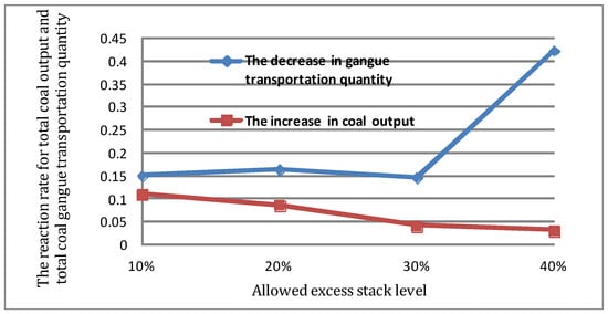 The reaction rate for total coal production quantity and total coal gangue transportation quantity compared to with different allowed excess stack levels.
