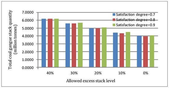 To ensure site selection equity in the presented facility recycling mechanism, the government is responsible for allocating a relatively satisfactory transportation capacity to each colliery (i.e., Equation (5)). Therefore, to guarantee a basic satisfaction degree for each colliery, the local authority sets a subjective parameter β in Equation (5). Table 6 shows the sensitivity analysis of parameter β when the allowed excess stack level φ is 40%, and Table 7, Table 8 and Table 9 show the sensitivity analysis of parameter φ under the changing basic satisfaction degree β. Taking as an example, according to the calculation results in Table 12, it can be found that when the government sets the basic satisfaction degree at with ; the coal gangue stack quantity is tonnes; when the local authority sets , the coal gangue stack quantity is tonnes, and it changes only 0.11%. When the local authority sets , the total stack quantity is tonnes, which changes only 0.016%. When the allowed excess stack level φ changes to 30%, 20%, 10% and 0%, the results are show in Figure 11, and the same conclusion can be obtained. The above results demonstrates that if the allowed excess stack level φ is fixed, changing basic satisfaction degree β does not significantly influence the total coal gangue stack quantity in coal fields. The reason can be explained by Equation (2), and the total stack quantity is mainly determined by the coal output and coal gangue transportation plan. Nevertheless, when the local authority sets a different satisfaction degree β with a fixed allowed excess stack level, the transportation capacity and the coal production in each colliery change rarely. Compared to huge stack costs, it is more efficient to take advantage of the transportation capacity. Under the circumstances, the changing excess stack level φ, which has huge impacts on coal output, is the main factor influencing the total coal gangue stack quantity.