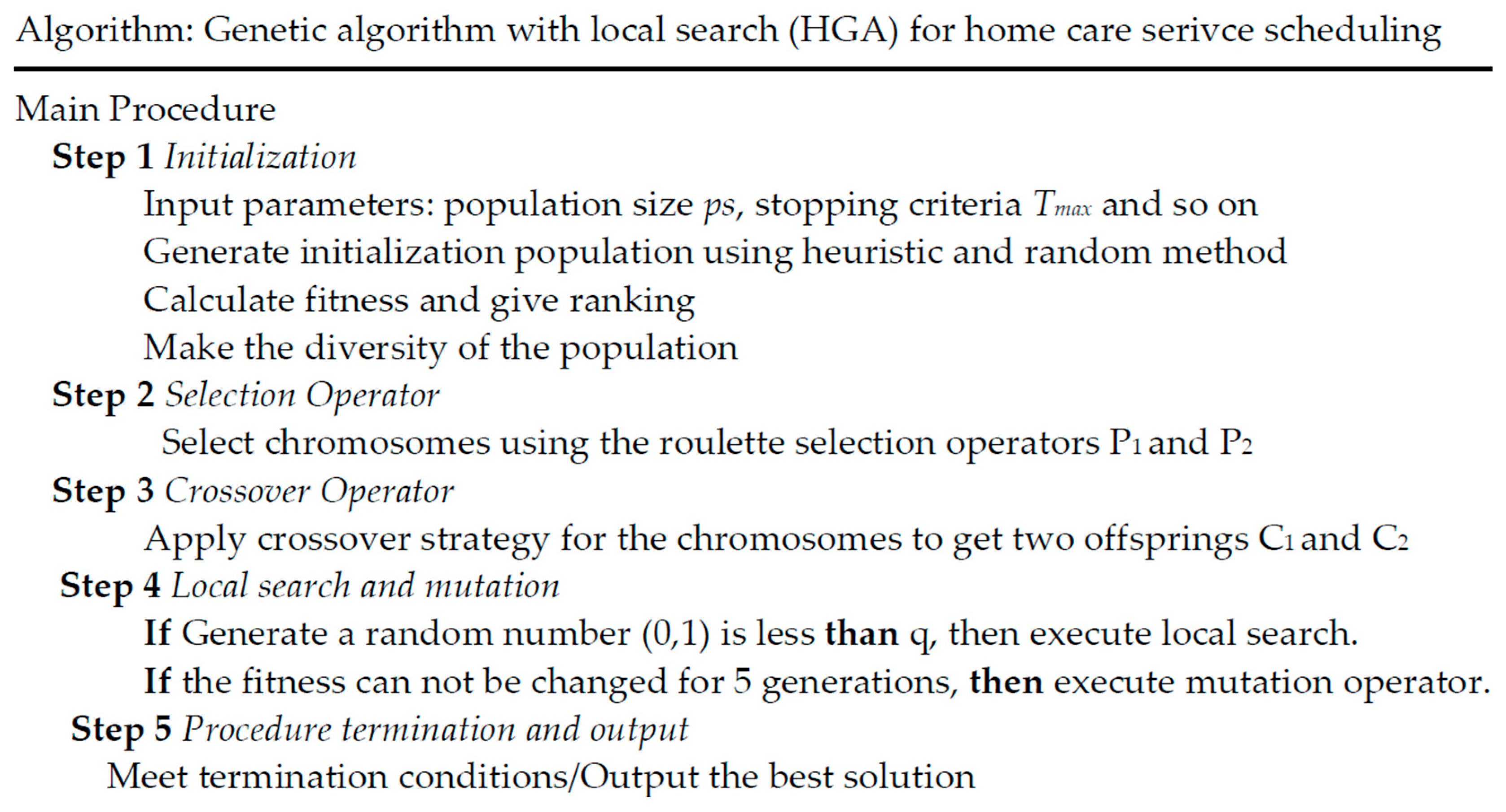 - Thomsen, K. Optimization on Home Care. Thesis in Informatics and Mathematical Modeling; Technical University of Denmark Copenhagen: Lyngby, Denmark, 2006. [Google Scholar]