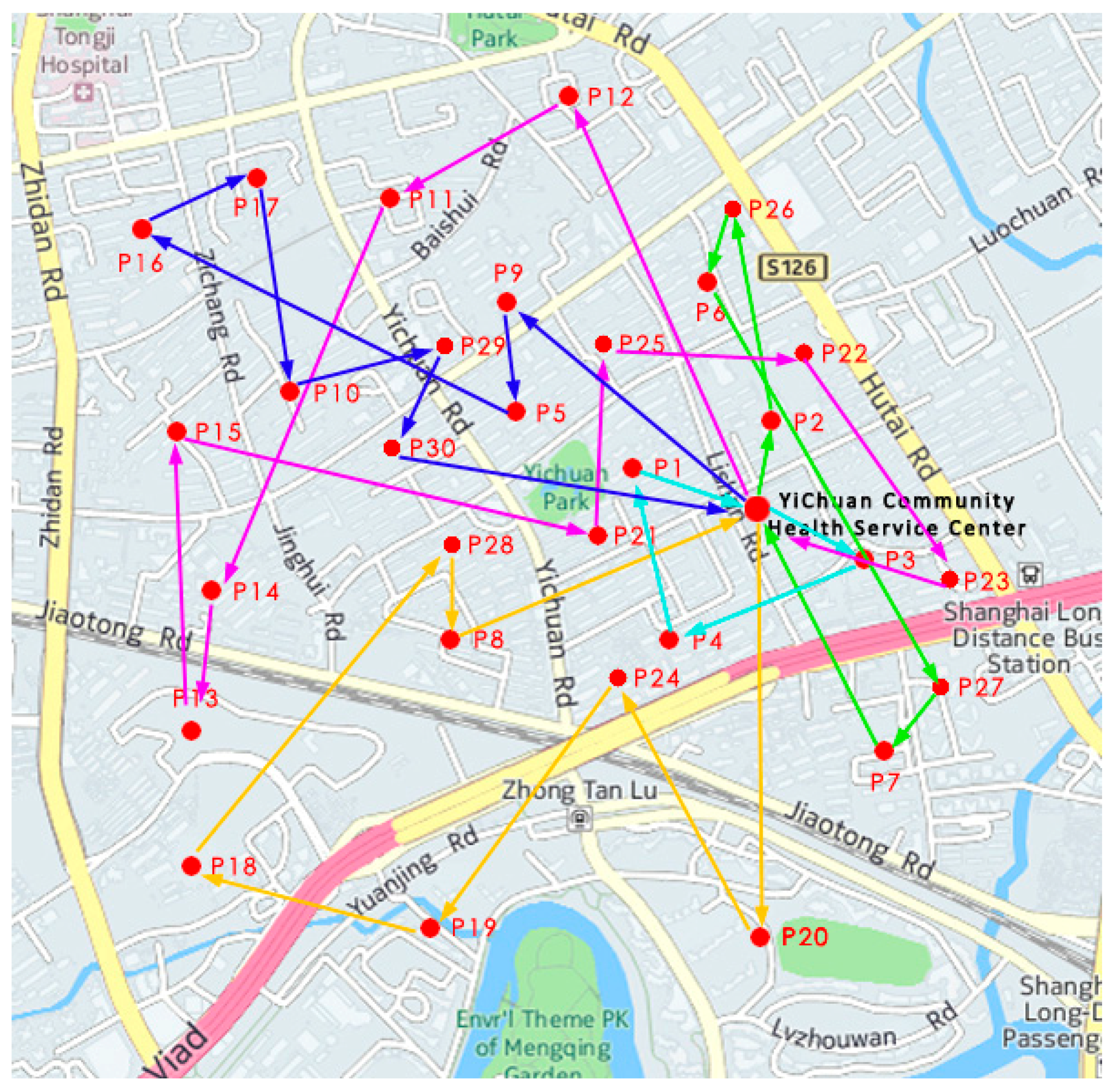 - Di represents the time that the medical staff take to leave service-required place i; , in which ei represents the earliest starting time accepted by the i-th patient; li represents the latest starting time accepted by the i-th patient;