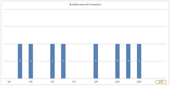 Figure 3, we can see that the first internal host raised one type of IDS alert. The name of the IDS alerts is “netbios xxxx smb Transaction”. Note that we sanitized the name of IDS alerts due to security. The first internal host raised 19 IDS alerts before the detection time (i.e., 15 January) of darknet traffic. From