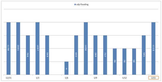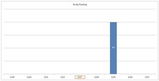 Figure 5, we can see that the third internal host raised one type of IDS alert. The name of IDS alerts is “udp flooding”. The third internal host raised 31 IDS alerts after the detection time (i.e., 23 January) of darknet traffic. From