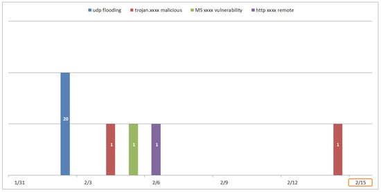 Figure 6, we can see that the fifth internal host raised four types of IDS alerts. The names of the IDS alerts are “udp flooding”, “trojan.xxxx malicious”, “MicroSoft (MS)xxxx vulnerability” and “http xxxx remote”. The fifth internal host raised 24 IDS alerts before the detection time (i.e., 15 February) of darknet traffic. From