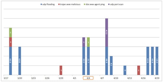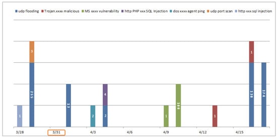 Figure 7, we can easily see that the sixth internal host raised seven different types of IDS alerts. Particularly, two alerts (i.e., “http xxx sqlinjection” and “udp port scan”) were recorded before the detection time (i.e., 31 March) of darknet traffic, while four alerts (i.e., “Trojan.xxxx malicious”, “MS xxxx vulnerability”, “http PHP xxxx SQL Injection” and “dos xxxx agent ping”) were raised after the detection time of darknet traffic.