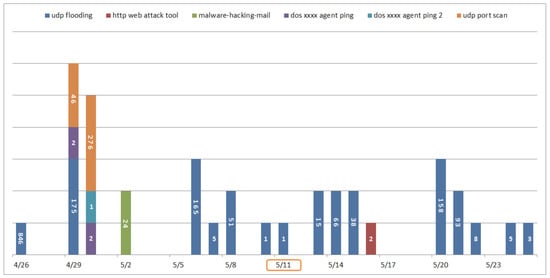 Figure 9, we can see that the eight internal host raised six different types of IDS alerts. Especially, four alerts (i.e., “udp port scan”, “dos xxxx agent ping”, “dosxxxx agent ping 2” and “malware-hacking-mail”) were recorded before the detection time (i.e., 11 May) of darknet traffic, while one alert (i.e., “http web attack tool”) was triggered after the detection time of darknet traffic. From