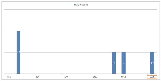 Figure 10, we can see that the third internal attack host raised one type of IDS alert. The name of IDS alert is “udp flooding”. The third internal attack host raised 28 IDS alerts before the detection time (i.e., 16 September) of darknet traffic.