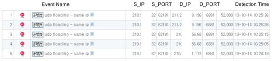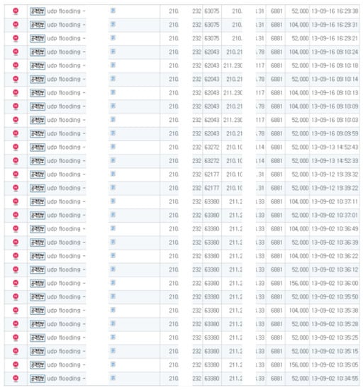 Figure 11 shows the examples of the “udp flooding” alerts. Note that we sanitized the name of the IDS alerts and the IP addresses for security. From