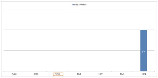 Figure 12, we can see that the ninth internal attack host raised one type of IDS alert. The name of IDS alert is “DNS Sinkhole”. The ninth internal attack host raised 10 IDS alerts after the detection time (i.e., 30 September) of darknet traffic.