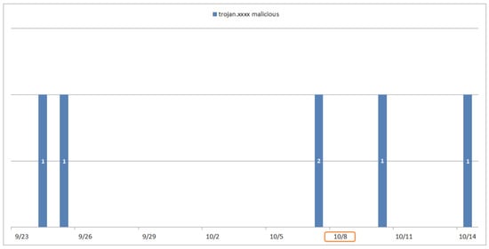 Figure 14, we can see that the 11th internal attack host raised one type of IDS alerts. The name of the IDS alert is “trojan.xxxx malicious”. The 11th internal attack host raised six IDS alerts before and after the detection time (i.e., 8 October) of darknet traffic.