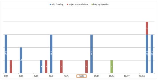 Figure 16, we can see that the 12th internal attack host raised three types of IDS alerts. The names of IDS alerts are “udp flooding”, “trojan.xxxx malicious” and “http sql injection”. The 12th internal attack host raised many IDS alerts before and after the detection time (i.e., 8 October) of darknet traffic.