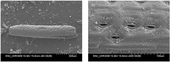 Scanning electron micrographs: the biochar particle size that showed the highest frequency and pore distribution on its surface (a); size of the pores on biochar surface (b).