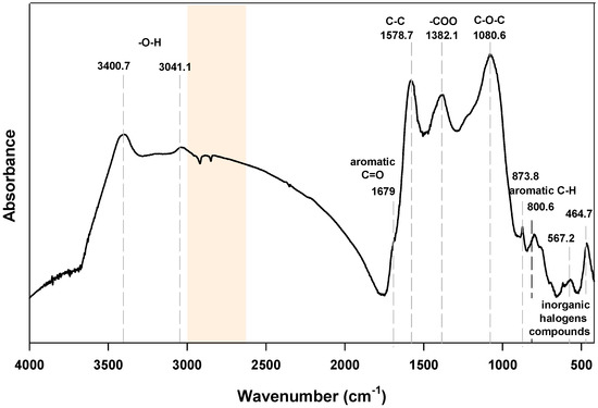 FTIR spectrum of corn residue biochar produced at 500 °C. Shaded area represents the hydrophobic wavenumbers.