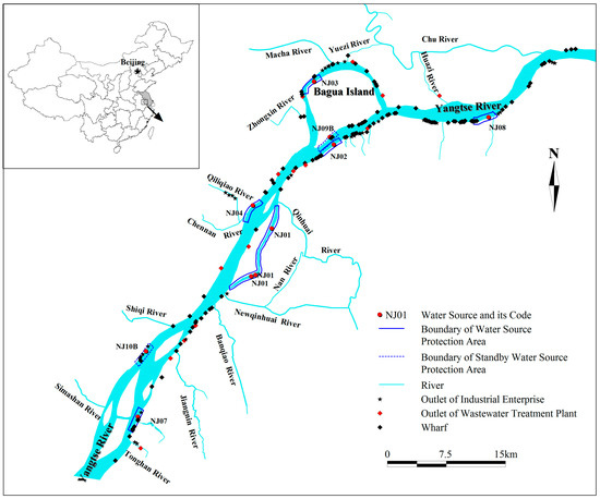 With the progression of urbanization and industrialization, 78% of China’s drinking water sources, as a highly sensitive water environment risk receptor, have been distributed with high water pollution risk enterprises in upstream [1]. Meanwhile, due to the frequent occurrence of environmental pollution accidents attributed to the level of enterprise management and other factors, a sharp increase in the probability of water source contamination emerges. Many cases have caused varying degrees of harms to the downstream water sources including Petro China Jilin’s benzene leakage accident occurred in the Songhua River in November 2005, Sinopec’s phosphoric acid leakage incident at the Changshan oil terminal wharf of Yangtze’s Jiangyin section in September 2008, and LCR petrochemical corporation’s phenol leakage accident at the wharf of Yangtze’s Zhenjiang–Yangzhou section in February 2012. Nevertheless, current China’s water resource regulatory authorities generally face problems such as lack of management techniques and poor operability [2]. Meanwhile, in the industrially-developed eastern areas, such as the areas along the Yangtze River in Jiangsu Province, water and risk sources are distributed alternately along the river. Moreover, there are numerous risk sources, which present a dense regional distribution. The above water source management problems and risk source distribution will lead to issues such as the difficulty in determining key risk supervision areas by water resource regulatory authorities; improper risk supervision for water sources; and inefficient risk management for water sources [3,4]. Therefore, it is necessary to assess the risk sources around the water sources, and screen key risk sources need supervision as well as key risk regulation areas. This will provide a reference for relevant environmental regulatory authorities to improve the management efficiency of drinking water sources.