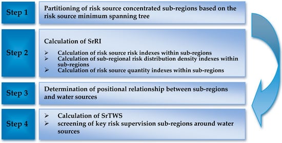 Risk source concentrated sub-regions were partitioned according to the distribution of risk sources around the water sources. Then, SrRI were calculated. SrTWS were calculated based on the SrRI and the positional relationship between the risk sources within sub-regions and the water sources. Key risk supervision sub-regions around water sources were screened. The specific procedure is shown in Figure 2.